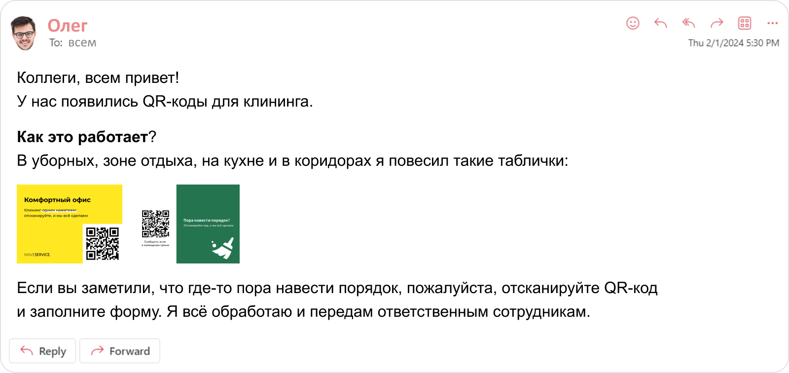 Оповестите сотрудников по привычным каналам связи (почта, информационная доска), зачем в здании появились QR-коды, и расскажите, как ими пользоваться.