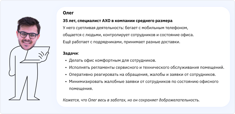Олег любит проявлять инициативу и предлагает руководству идеи по улучшению процессов. В общем, Олег — современный специалист АХО.