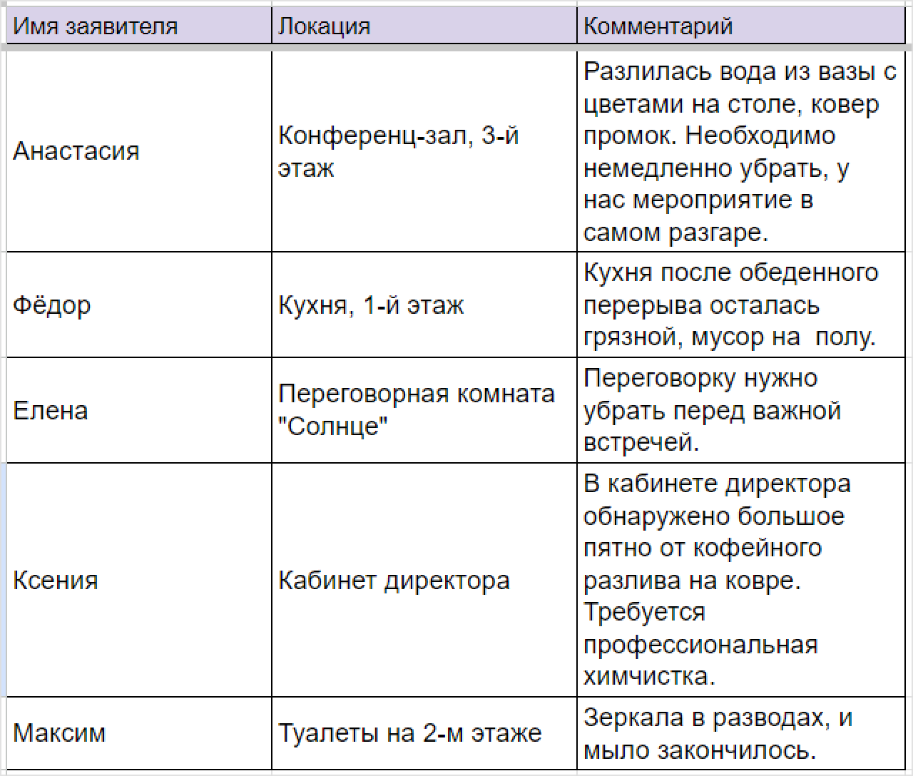 - Пропишите в форме заявки на уборку помещений уточняющие вопросы: например, контакты заявителя, указание места, где нужна уборка, и комментарии, чтобы люди могли высказаться.