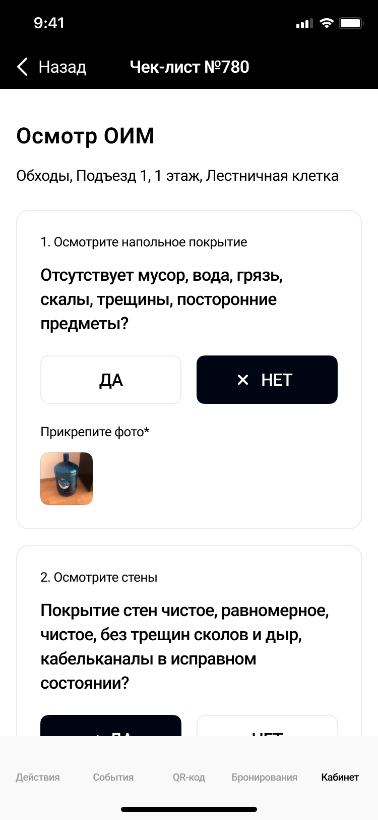 На самом деле, наши клиенты редко пользуются геолокацией и валидацией по QR-кодам. Как правило, отношения исполнителей и руководителей всё-таки доверительные, и многие системы — не попытка контроля, а, напротив, дружелюбный помощник. Поэтому хватает и фотофиксации — подтверждения фотографией. Загрузить фото из галереи, кстати, не получится, придётся делать вживую. -