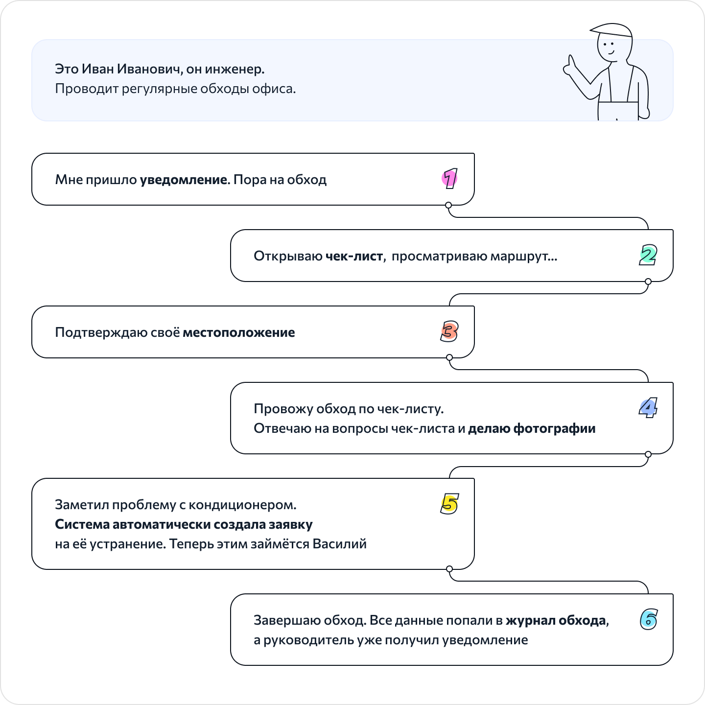 Ниже кратко описали три кейса об автоматизированных обходах на объектах наших клиентов, и подчеркнули, как этот модуль помогает бизнесу.