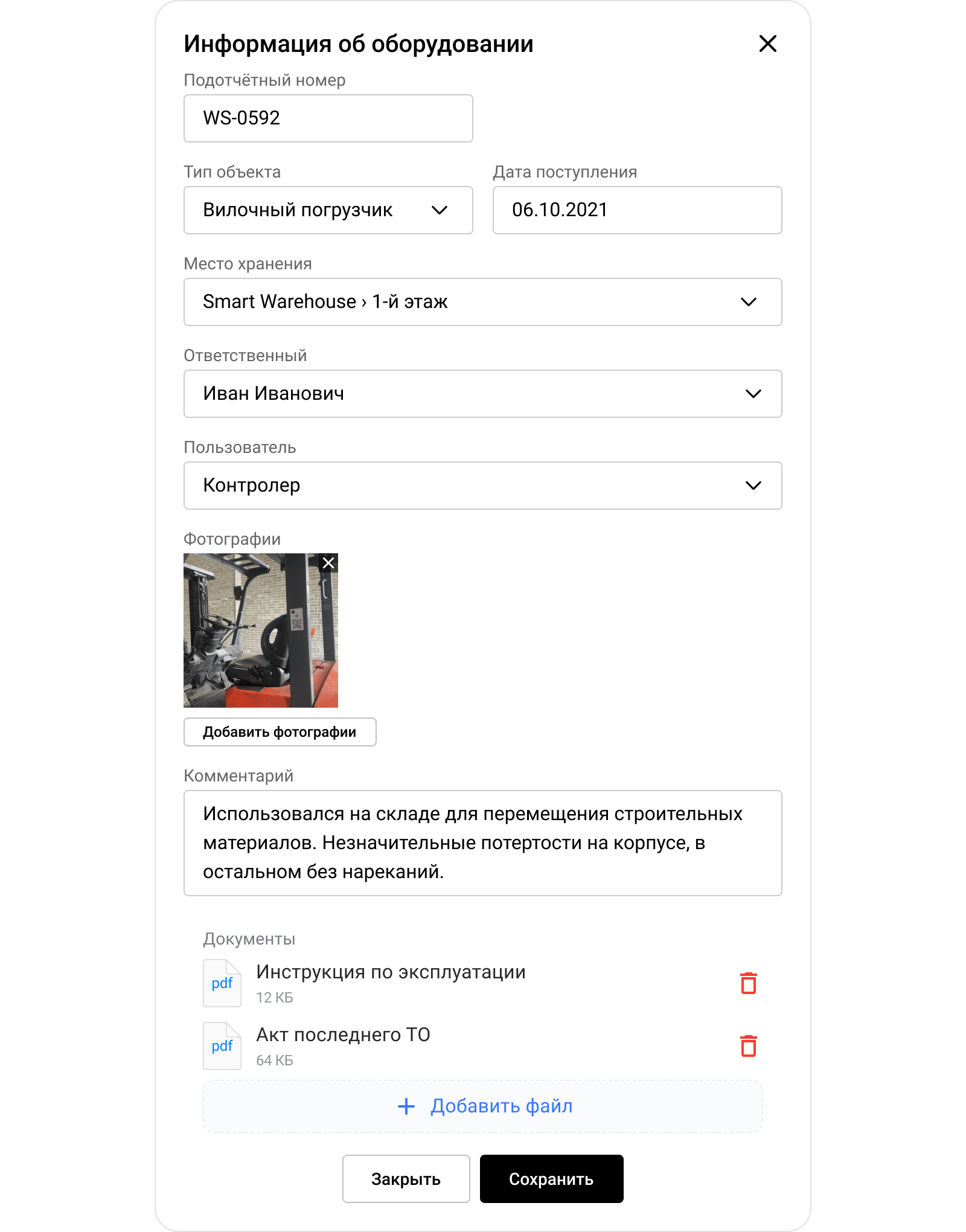 Пример заполненной карточки. В карточку объекта можно внести необходимую документацию и составить подробное описание