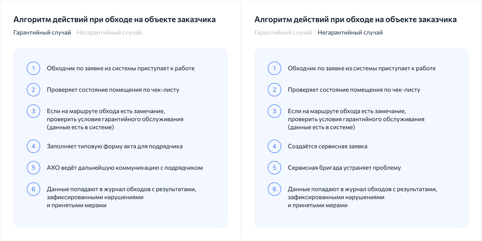 Ранее контролем состояния помещений занимались по остаточному принципу: кто-то выявлял проблему, передавал информацию ответственным за помещение, освободившийся исполнитель занимался решением. Такой подход заказчика не устраивал, потому что от этого страдало качество проверок.
