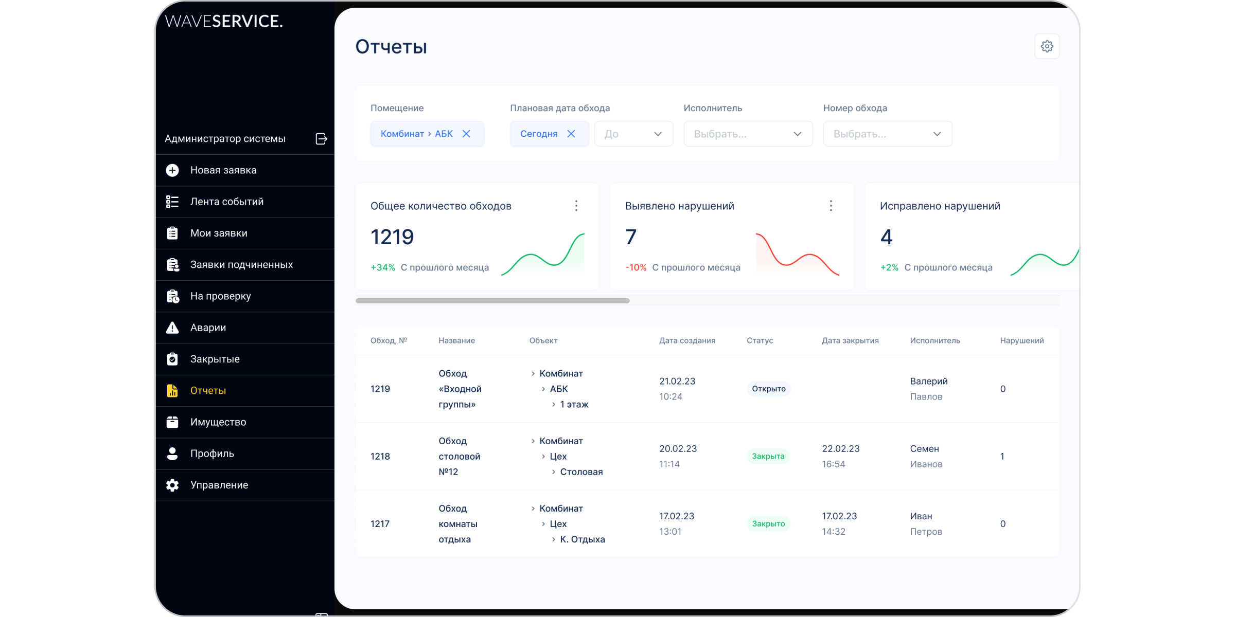 - Отчёты по результатам обходов повышают прозрачность, а также помогают контролировать качество работы сервисной бригады.