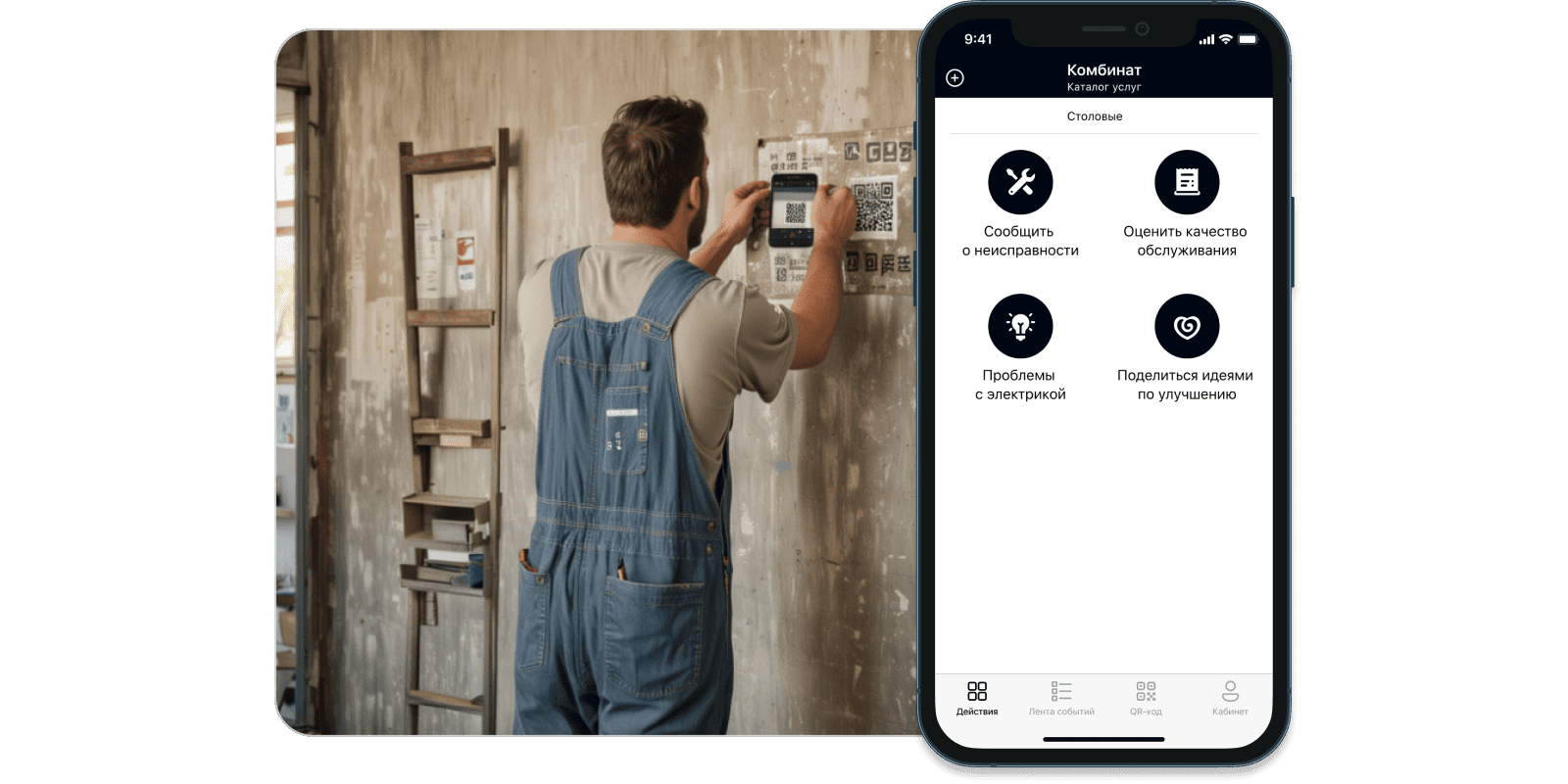 Пример размещения QR-кода в столовых - Сотрудник сканирует код и на экране появляется каталог услуг, где он может описать проблему.