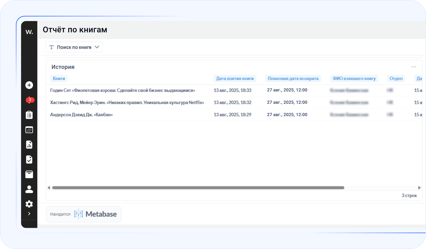 Здесь видна вся история движения книг: кто взял, когда, из какого отдела, когда вернули, кому из сотрудников стойки ресепшн лично в руки отдали. Последнее — дополнительный элемент контроля как для того, кто берёт книги, так и для того, кто их принимает. - Публичный