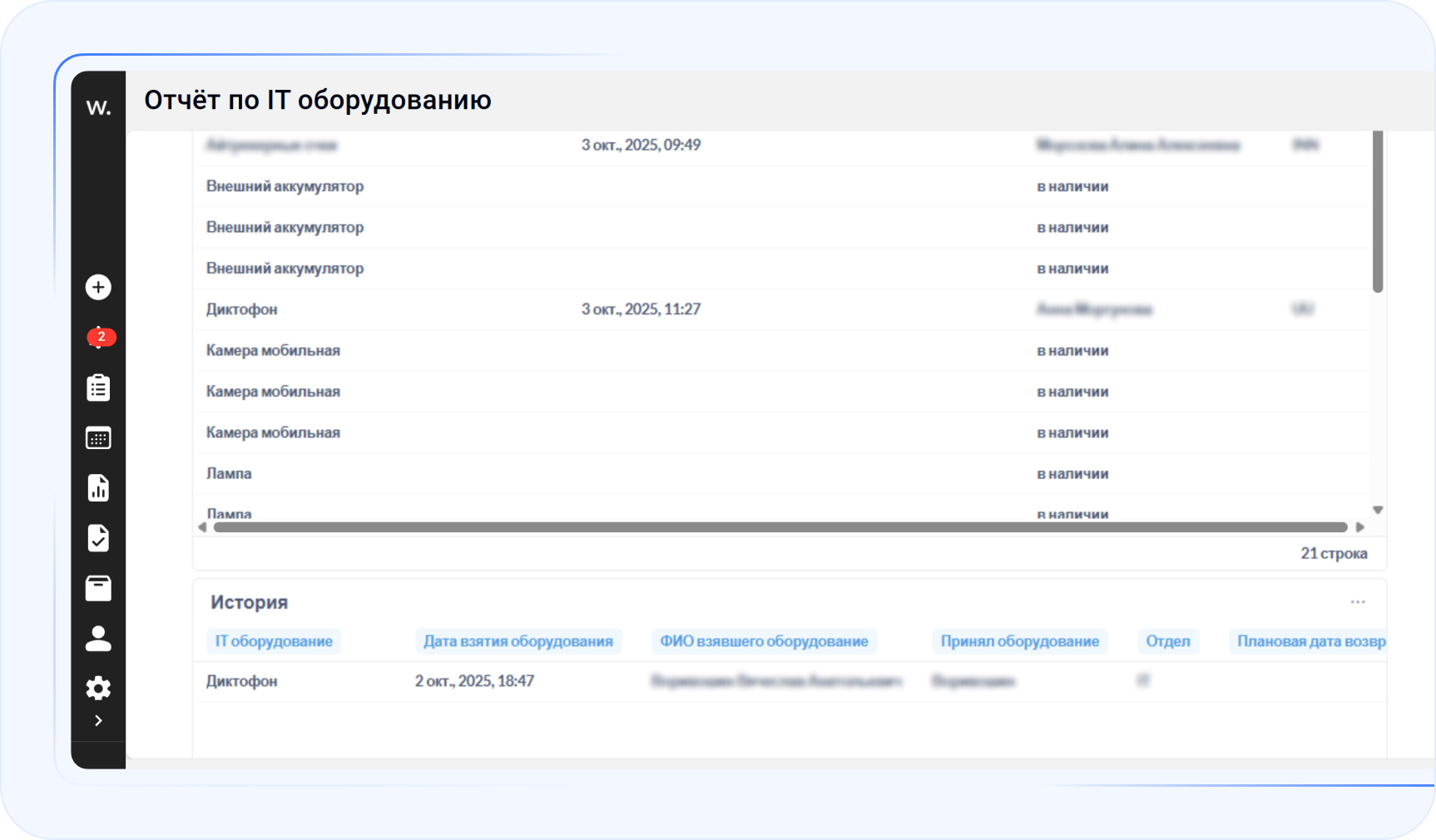 Теперь проще: на дашборде видно всё сразу, у кого техника на руках, кто и когда её выдал, когда планируется возврат и кто принял обратно — если устройство уже вернули.
