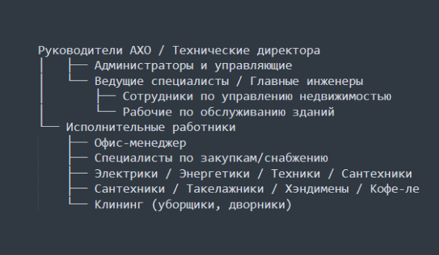 Электрики, сантехники, такелажники, хэндимены и кофе-леди — линейный персонал отдела, как правило, подчиняются завхозам или офис-менеджеру. В некоторых компаниях эти задачи могут отдавать на аутсорс.