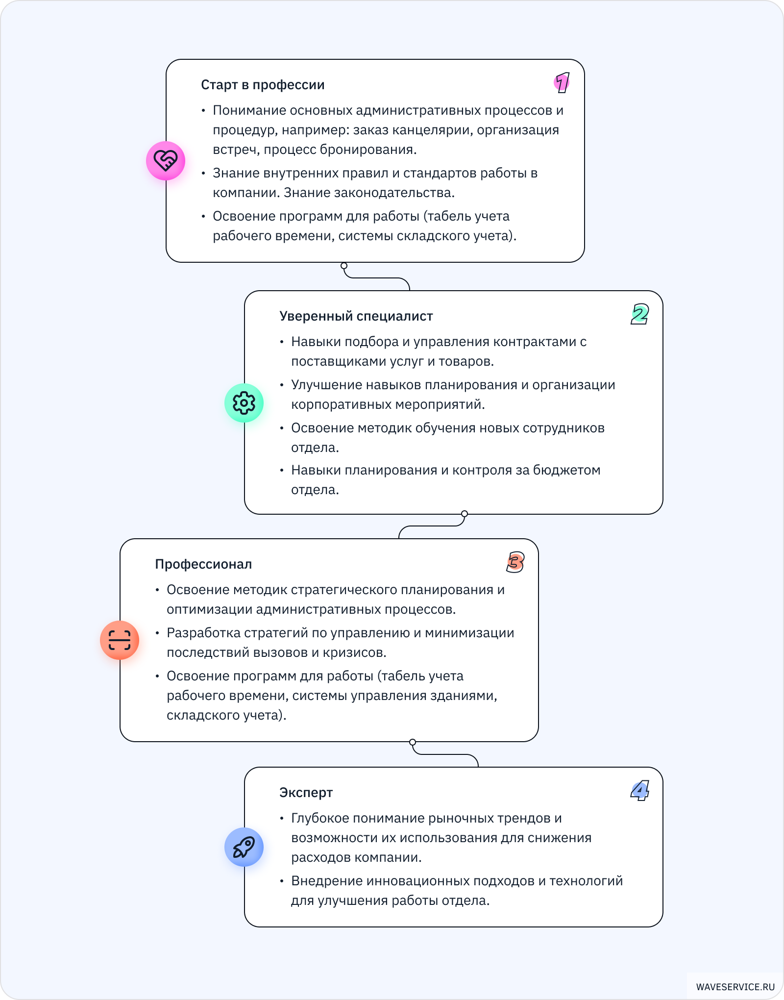 Так как задачи, обязанности и функции специалистов АХО в разных индустриях и компаниях могут сильно отличаться, мы попытались собрать общую картину без упоминания нюансов. Ступени роста обозначили привычной градацией от новичка до эксперта.