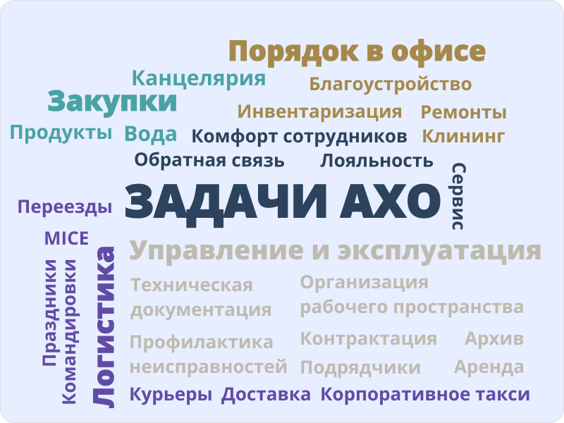 АХО также отвечает за работу с подрядчиками и органами государственного надзора, контрактации, взаимодействие с управляющими компаниями. - Административные задачи и документооборот