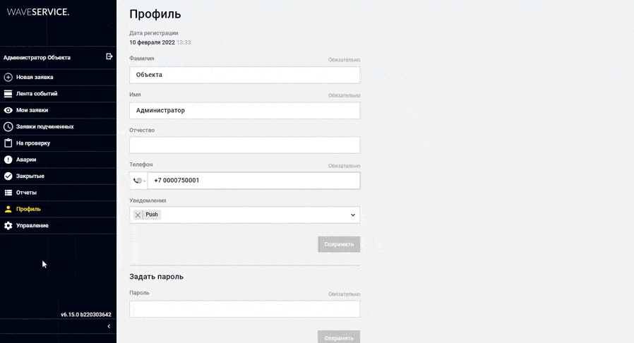 Для управления помещениями и их типами пользователю требуется роль «Администратор». Чтобы получить данную роль, обратитесь к ответственному за Wave Service сотруднику компании.